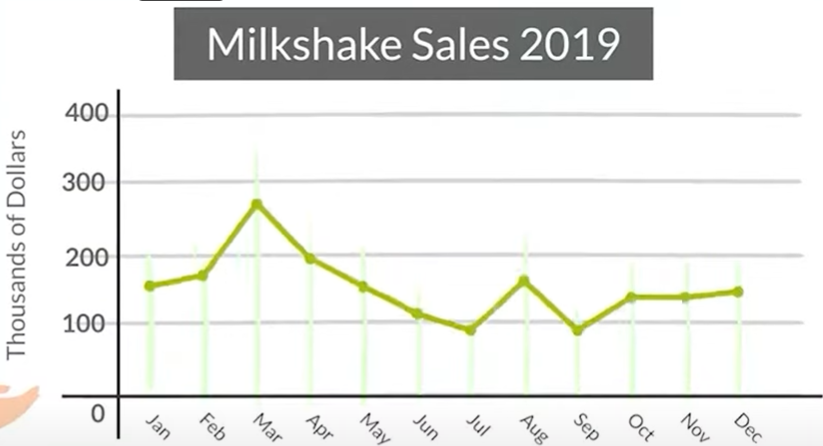 | In 2019, milkshake sales demonstrated notable fluctuations across the year. The first quarter saw strong growth, peaking in March at 350 thousand dollars. However, this upward trend reversed in the second quarter, with sales steadily declining to a low of 100 thousand in June. The third quarter presented modest recovery and variation—sales rose to 150 thousand in July, dipped again in August, then regained slight strength by September. October and November reflected a stable phase with minimal change, followed by a mild uptick in December, closing the year at approximately 150 thousand dollars. Overall, the data suggests significant seasonality in consumer behavior, with peak performance occurring in early spring and gradual stabilization toward year-end.” |