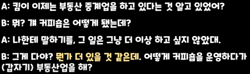 A : (Hey) Did you konw that KIM is a realtor now? B : What? What happened to her coffe shop? A : Well, she told me that she just didn't feel like doing that any more. B : That's it? There has to be more to it than that. I mean, how do you go from running a coffee shop to becoming a realtor? |