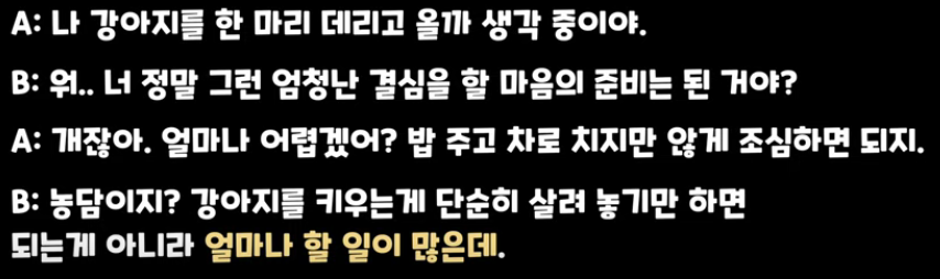 | A : I am thinking B : oh.. are you sure that you are ready A : It's just a dog. How hard is it? It's just feeding, B : Are you kidding? |