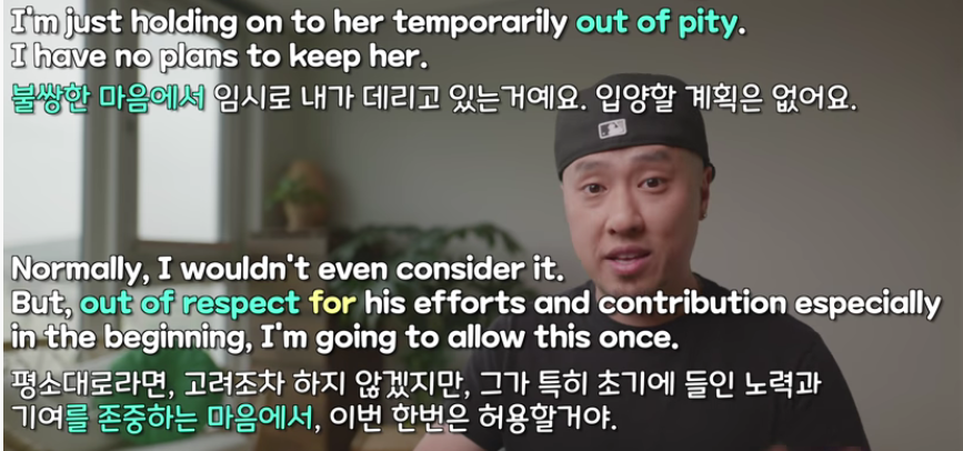 - out of pity : 불쌍한 마음으로부터
